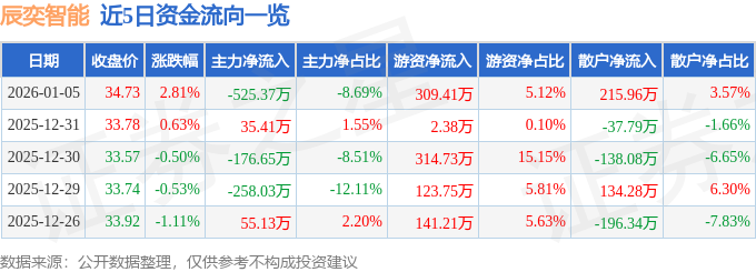 证券之星消息,截至2026年1月5日收盘,辰奕智能(301578)报收于34.73元,上涨2.81%,换手率7.57%,成交量1.75万手,成交额6048.93万元。
