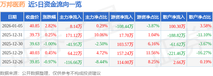 证券之星消息,截至2026年1月5日收盘,万邦医药(301520)报收于40.85元,上涨2.82%,换手率3.07%,成交量6879.0手,成交额2804.58万元。