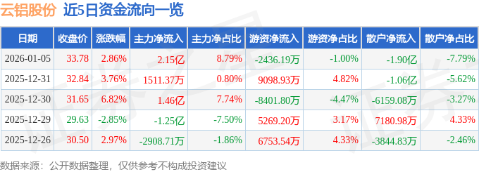 证券之星消息,截至2026年1月5日收盘,云铝股份(000807)报收于33.78元,上涨2.86%,换手率2.07%,成交量71.94万手,成交额24.41亿元。