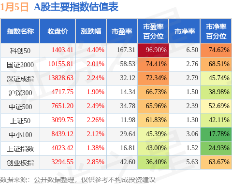 A股主要宽基指数方面,科创50的市盈率百分位较高,为96.9%。而创业板指的市盈率百分位较低,为36.4%。