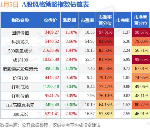 风格策略指数方面,国信价值的市盈率百分位较高,为97.81%。而300成长的市盈率百分位较低,为57.38%。