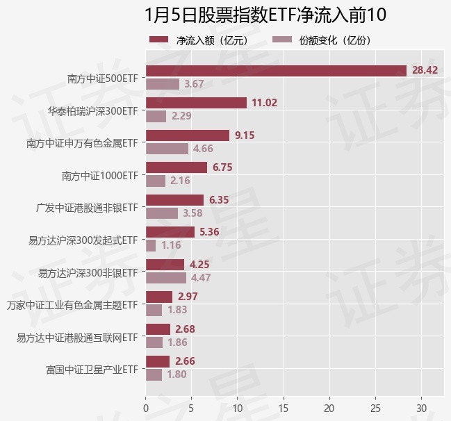 当日有148只股票指数ETF基金出现资金净流入,其中净流入排首位的是南方中证500ETF(510500),份额增加了3.67亿份,净流入额为28.42亿元。