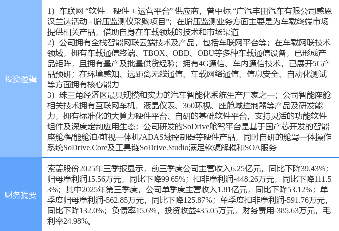 该股为胎压监测,智能座舱,车联网/车路云概念热股,当日胎压监测概念上涨3.79%,智能座舱概念上涨3.03%,车联网/车路云概念上涨2.72%。