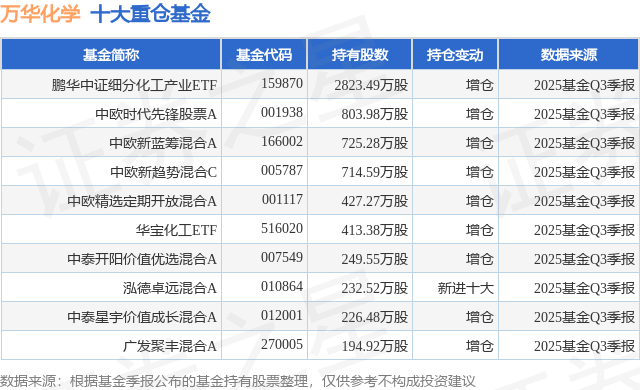 根据2025基金Q3季报公募基金重仓股数据,重仓该股的公募基金共144家,其中持有数量最多的公募基金为鹏华基金的鹏华中证细分化工产业ETF。鹏华中证细分化工产业ETF目前规模为185.44亿元,最新净值0.8338(1月5日),较上一交易日上涨1.29%,近一年上涨49.05%。该公募基金现任基金经理为闫冬。闫冬在任的基金产品包括:鹏华中证800地产指数(LOF)A,管理时间为2019年4月30日至今,期间收益率为-41.77%;鹏华中证A股资源产业指数(LOF)A,管理时间为2019年11月20日至今,期间收益率为173.38%;鹏华中证光伏产业ETF,管理时间为2021年2月22日至今,期间收益率为-4.55%;