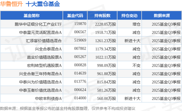 根据2025基金Q3季报公募基金重仓股数据,重仓该股的公募基金共126家,其中持有数量最多的公募基金为鹏华基金的鹏华中证细分化工产业ETF。鹏华中证细分化工产业ETF目前规模为185.44亿元,最新净值0.8338(1月5日),较上一交易日上涨1.29%,近一年上涨49.05%。该公募基金现任基金经理为闫冬。闫冬在任的基金产品包括:鹏华中证800地产指数(LOF)A,管理时间为2019年4月30日至今,期间收益率为-41.77%;鹏华中证A股资源产业指数(LOF)A,管理时间为2019年11月20日至今,期间收益率为173.38%;鹏华中证光伏产业ETF,管理时间为2021年2月22日至今,期间收益率为-4.55%;