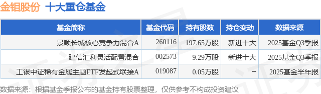 根据2025基金Q3季报公募基金重仓股数据,重仓该股的公募基金共2家,其中持有数量最多的公募基金为景顺长城基金的景顺长城核心竞争力混合A。景顺长城核心竞争力混合A目前规模为9.6亿元,最新净值3.721(1月5日),较上一交易日上涨1.92%,近一年上涨22.81%。该公募基金现任基金经理为余广。余广在任的基金产品包括:景顺长城核心优选一年持有混合,管理时间为2020年5月8日至今,期间收益率为28.52%;景顺长城核心中景一年持有混合,管理时间为2020年12月16日至今,期间收益率为-19.82%;景顺长城核心招景混合A,管理时间为2021年1月6日至今,期间收益率为-20.17%。