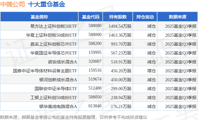 重仓中微公司的前十大公募基金请见下表: