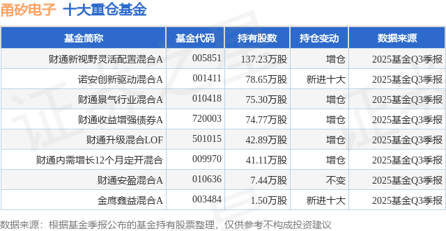 根据2025基金Q3季报公募基金重仓股数据,重仓该股的公募基金共8家,其中持有数量最多的公募基金为财通基金的财通新视野灵活配置混合A。财通新视野灵活配置混合A目前规模为4.31亿元,最新净值3.5879(1月5日),较上一交易日上涨2.67%,近一年上涨81.7%。该公募基金现任基金经理为沈犁。沈犁在任的基金产品包括:财通多策略升级混合(LOF)A,管理时间为2021年4月14日至今,期间收益率为109.1%;财通景气行业混合A,管理时间为2022年4月7日至今,期间收益率为78.06%;财通多策略精选混合(LOF),管理时间为2024年7月4日至今,期间收益率为29.37%。