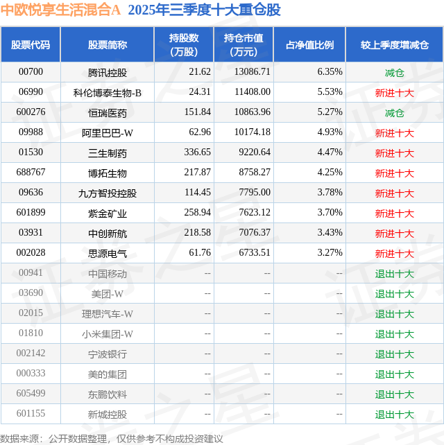 中欧悦享生活混合A的前十大重仓股如下: