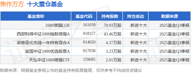 根据2025基金Q3季报公募基金重仓股数据,重仓该股的公募基金共5家,其中持有数量最多的公募基金为富国基金的1000增强LOF。1000增强LOF目前规模为7.8亿元,最新净值2.654(1月5日),较上一交易日上涨1.93%,近一年上涨43.98%。该公募基金现任基金经理为徐幼华 方旻。徐幼华在任的基金产品包括:富国中证红利指数增强A,管理时间为2011年5月13日至今,期间收益率为203.46%;富国大盘价值量化精选混合A,管理时间为2018年7月19日至今,期间收益率为72.91%;富国MSCI中国A股国际通指数增强A,管理时间为2018年12月25日至今,期间收益率为152.44%。方旻在任的基金产品包括:富国中证红利指数增强A,管理时间为2014年11月19日至今,期间收益率为205.83%;富国沪深300指数增强A,管理时间为2014年11月19日至今,期间收益率为189.61%;富国中证500指数增强(LOF)A,管理时间为2014年11月19日至今,期间收益率为157.65%;上证综指ETF,管理时间为2014年11月19日至今,期间收益率为129.47%。