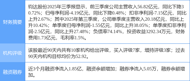 2025年12月23日,国金证券研究员姚遥发布了对钧达股份的研报《掘金万亿市场,打造太空光伏引领者》,该研报对钧达股份给出“买入”评级。研报中预计2025-2027年公司归母净利润预测至-5.58/5.77/10.20亿元,维持“买入”评级。证券之星数据中心根据近三年发布的研报数据计算,该研报作者对此股的盈利预测准确度为76.6%。