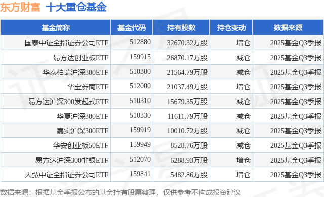 根据2025基金Q3季报公募基金重仓股数据,重仓该股的公募基金共419家,其中持有数量最多的公募基金为国泰基金的国泰中证全指证券公司ETF。国泰中证全指证券公司ETF目前规模为553.34亿元,最新净值1.235(1月5日),较上一交易日上涨1.86%,近一年上涨14.67%。该公募基金现任基金经理为艾小军。艾小军在任的基金产品包括:国泰金融ETF联接A,管理时间为2014年1月13日至今,期间收益率为179.32%;国泰上证180金融ETF,管理时间为2014年1月13日至今,期间收益率为199.49%;国泰黄金ETF,管理时间为2014年1月13日至今,期间收益率为281.09%;国泰中证计算机主题ETF联接A,管理时间为2015年3月26日至今,期间收益率为-1.79%。
