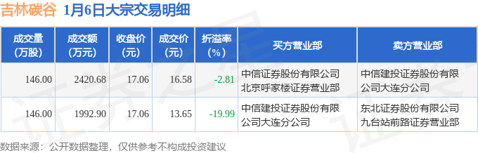 证券之星消息,1月6日吉林碳谷发生大宗交易,交易数据如下: