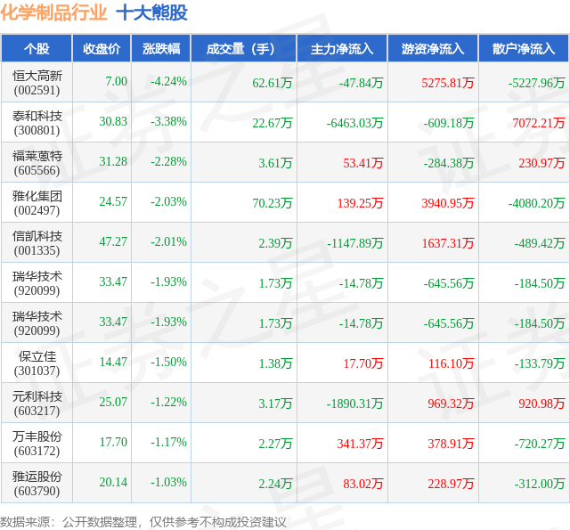 个股表现方面,化学制品行业当日领跌股为恒大高新(002591),该股当日报收7.0,下跌4.24%,成交量62.61万,主力资金净流出47.84万元。泰和科技(300801)以下跌3.38%紧随其后,该股当日成交量22.67万,主力资金净流出6463.03万元。除此之外,福莱蒽特(605566)、雅化集团(002497)、信凯科技(001335)均进入当日熊股之列。具体个股列表见下表: