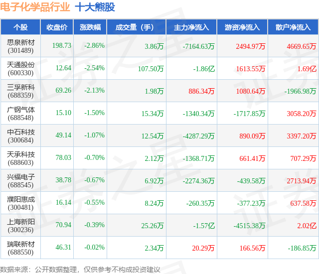 个股表现方面,电子化学品行业当日领跌股为思泉新材(301489),该股当日报收198.73,下跌2.86%,成交量3.86万,主力资金净流出7164.63万元。天通股份(600330)以下跌2.54%紧随其后,该股当日成交量107.5万,主力资金净流出1.86亿元。除此之外,三孚新科(688359)、广钢气体(688548)、中石科技(300684)均进入当日熊股之列。具体个股列表见下表: