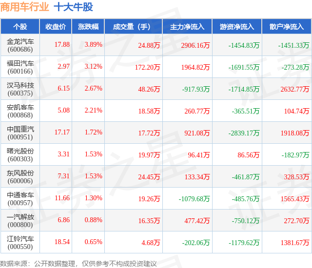 个股表现方面,商用车行业当日领涨股为金龙汽车(600686),该股当日报收17.88,上涨3.89%,成交量24.88万,主力资金净流入2906.16万元。福田汽车(600166)以上涨3.12%紧随其后,该股当日成交量172.2万,主力资金净流入1964.82万元。除此之外,汉马科技(600375)、安凯客车(000868)、中国重汽(000951)均进入当日牛股之列。具体个股列表见下表: