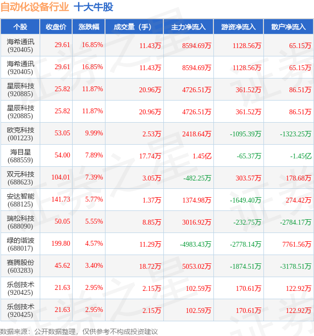 个股表现方面,自动化设备行业当日领涨股为海希通讯(920405),该股当日报收29.61,上涨16.85%,成交量11.43万,主力资金净流入8594.69万元。海希通讯(920405)以上涨16.85%紧随其后,该股当日成交量11.43万,主力资金净流入8594.69万元。除此之外,星辰科技(920885)、星辰科技(920885)、欧克科技(001223)均进入当日牛股之列。具体个股列表见下表: