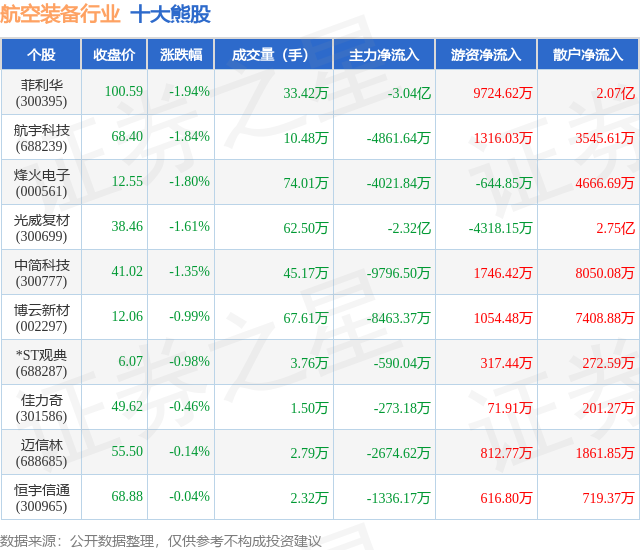 个股表现方面,航空装备行业当日领跌股为菲利华(300395),该股当日报收100.59,下跌1.94%,成交量33.42万,主力资金净流出3.04亿元。航宇科技(688239)以下跌1.84%紧随其后,该股当日成交量10.48万,主力资金净流出4861.64万元。除此之外,烽火电子(000561)、光威复材(300699)、中简科技(300777)均进入当日熊股之列。具体个股列表见下表: