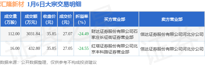 证券之星消息,1月6日汇隆新材发生大宗交易,交易数据如下: