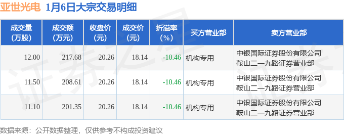证券之星消息,1月6日亚世光电发生大宗交易,交易数据如下: