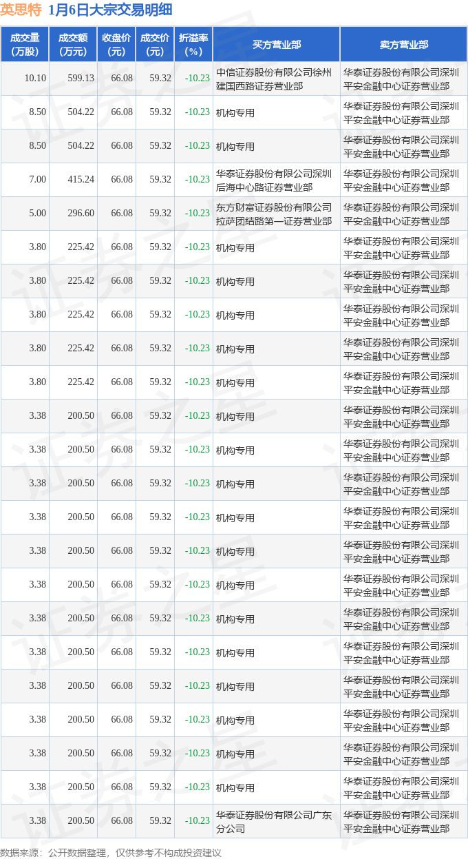 证券之星消息,1月6日英思特发生大宗交易,交易数据如下: