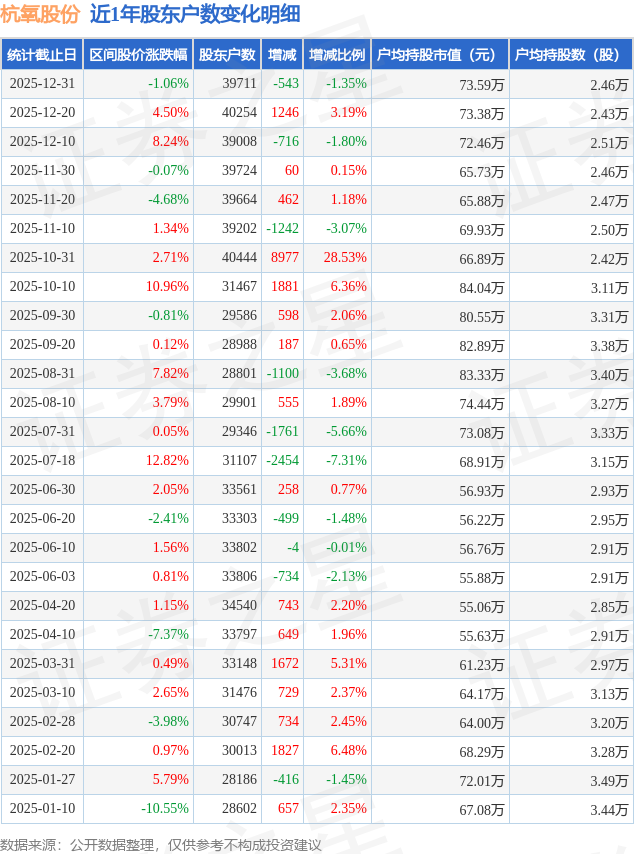 证券之星消息,近日杭氧股份披露,截至2025年12月31日公司股东户数为3.97万户,较12月20日减少543.0户,减幅为1.35%。户均持股数量由上期的2.43万股增加至2.46万股,户均持股市值为73.59万元。