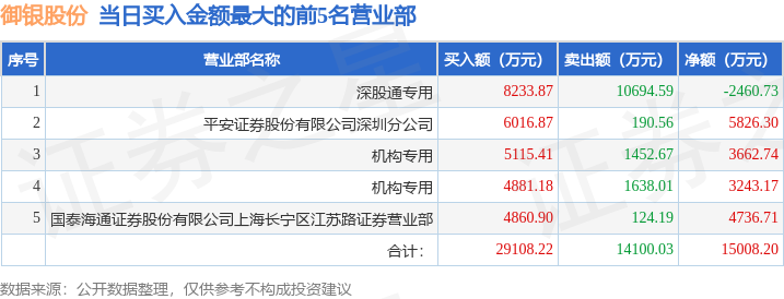 从龙虎榜公布的当日买卖数据来看,机构合计净买入6905.91万元,北向资金合计净卖出2460.73万元。章盟主、北京中关村、小棉袄等知名游资榜上有名。(知名游资章盟主一般指国泰海通证券股份有限公司上海长宁区江苏路证券营业部席位、知名游资北京中关村一般指中国银河证券股份有限公司北京中关村大街证券营业部席位、知名游资小棉袄一般指上海证券有限责任公司上海分公司席位,根据市场资料整理,仅供参考)