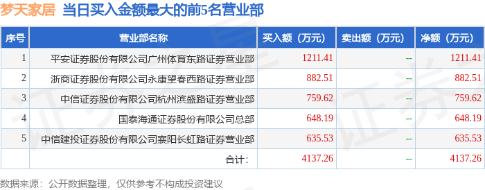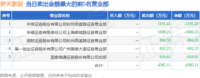 证券之星消息,沪深交易所2026年1月6日公布的交易公开信息显示,梦天家居(603216)因有价格涨跌幅限制的日收盘价格跌幅偏离值达到7%的前五只证券登上龙虎榜。此次是近5个交易日内第2次上榜。