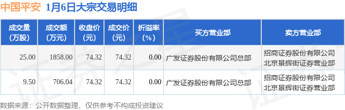 证券之星消息,1月6日中国平安发生大宗交易,交易数据如下: