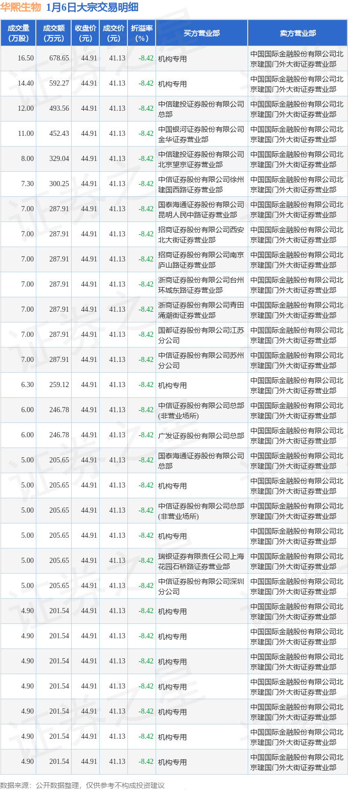 证券之星消息,1月6日华熙生物发生大宗交易,交易数据如下: