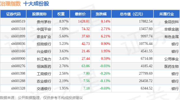 治理指数(000019)十大成份股详情如下: