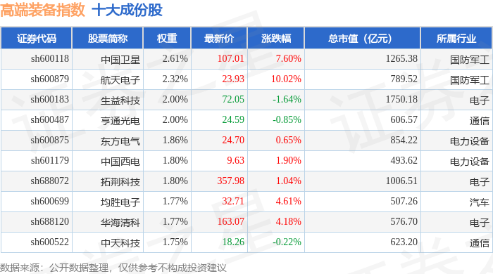 高端装备(000097)指数十大成份股详情如下: