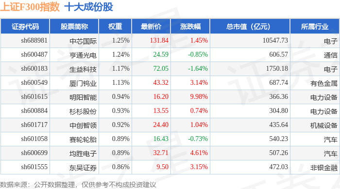 证券之星消息,1月6日,上证F300(000099)指数报收于9414.63点,涨1.97%,成交2510.16亿元,换手率1.98%。当日该指数成份股中,上涨的有260家,江河集团以10.06%的涨幅领涨,下跌的有30家,宝胜股份以3.54%的跌幅领跌。