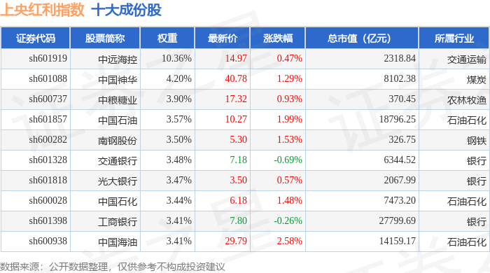 证券之星消息,1月6日,上央红利(000152)指数报收于2869.07点,涨0.69%,成交314.14亿元,换手率0.24%。当日该指数成份股中,上涨的有24家,中煤能源以4.0%的涨幅领涨,下跌的有6家,中信银行以1.46%的跌幅领跌。