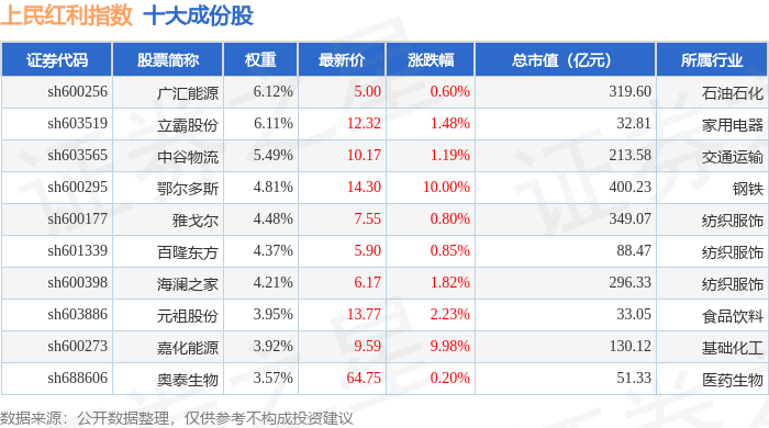 证券之星消息,1月6日,上民红利(000153)指数报收于3184.18点,涨1.87%,成交93.36亿元,换手率2.19%。当日该指数成份股中,上涨的有22家,鄂尔多斯以10.0%的涨幅领涨,下跌的有6家,中创物流以3.9%的跌幅领跌。