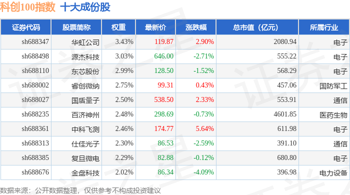 科创100(000698)指数十大成份股详情如下: