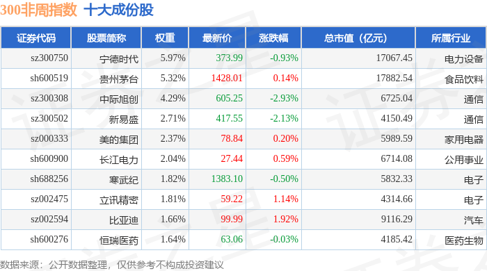 300非周(000969)指数十大成份股详情如下: