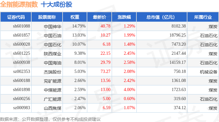全指能源(000986)指数十大成份股详情如下: