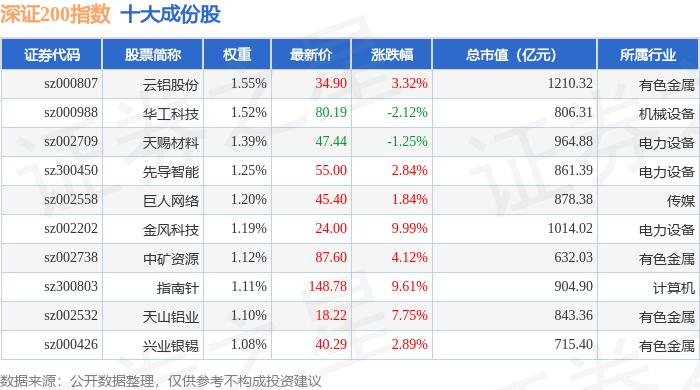 深证200(399009)指数十大成份股详情如下:
