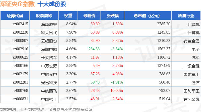 证券之星消息,1月6日,深证央企(399335)指数报收于4469.37点,涨1.91%,成交660.13亿元,换手率1.48%。当日该指数成份股中,上涨的有41家,中航西飞以10.0%的涨幅领涨,下跌的有8家,深南电路以3.34%的跌幅领跌。