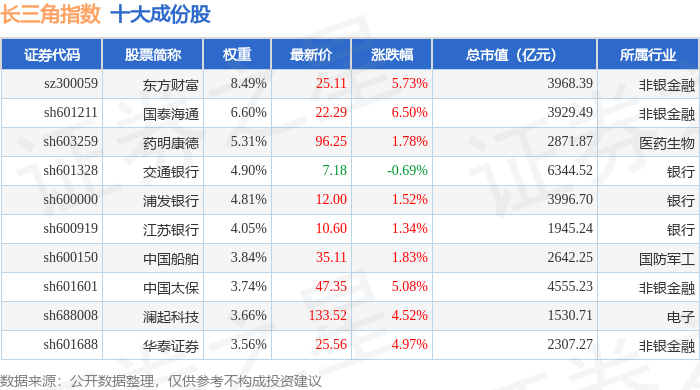 长三角(399355)指数十大成份股详情如下: