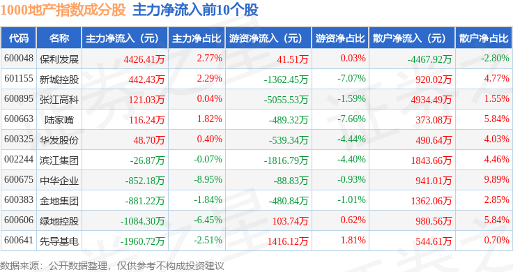 资金流向方面,1000地产(399367)指数成份股当日主力资金净流出合计2.85亿元,游资资金净流出合计4926.83万元,散户资金净流入合计3.35亿元。成份股资金流向详情见下表: