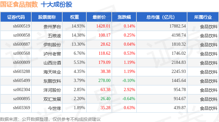 证券之星消息,1月6日,国证食品(399396)指数报收于17880.03点,涨0.56%,成交224.04亿元,换手率0.95%。当日该指数成份股中,上涨的有46家,千禾味业以3.09%的涨幅领涨,下跌的有3家,双汇发展以0.64%的跌幅领跌。