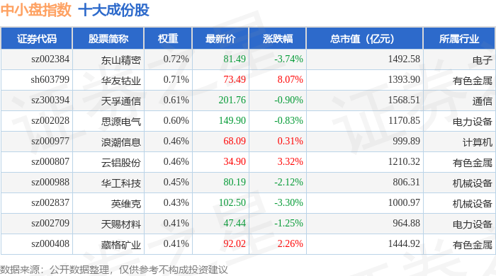 证券之星消息,1月6日,中小盘(399401)指数报收于5012.41点,涨1.92%,成交8913.91亿元,换手率2.62%。当日该指数成份股中,上涨的有672家,华测导航以16.13%的涨幅领涨,下跌的有119家,金盘科技以4.09%的跌幅领跌。