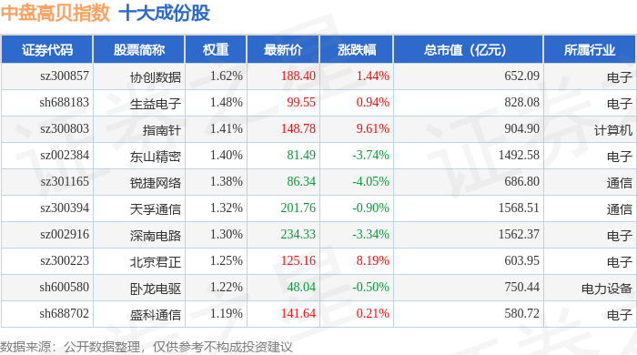 证券之星消息,1月6日,中盘高贝(399407)指数报收于3296.62点,涨1.65%,成交2208.02亿元,换手率3.46%。当日该指数成份股中,上涨的有81家,德赛西威以10.0%的涨幅领涨,下跌的有19家,锐捷网络以4.05%的跌幅领跌。