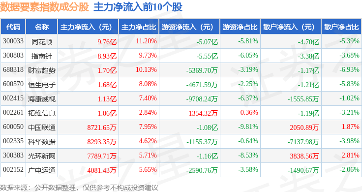 资金流向方面,数据要素(399418)指数成份股当日主力资金净流入合计3.88亿元,游资资金净流出合计12.85亿元,散户资金净流入合计8.98亿元。成份股资金流向详情见下表: