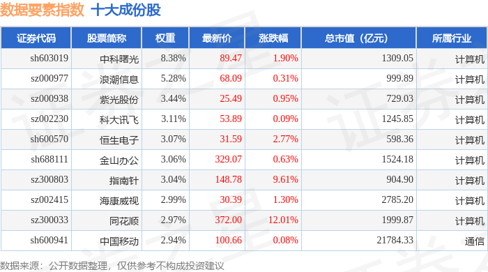 数据要素(399418)指数十大成份股详情如下: