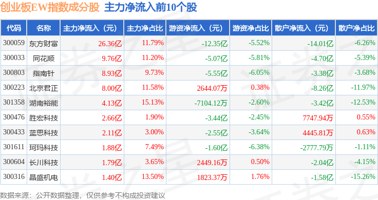 资金流向方面,创业板EW(399635)指数成份股当日主力资金净流出合计63.74亿元,游资资金净流入合计32.74亿元,散户资金净流入合计31.0亿元。成份股资金流向详情见下表: