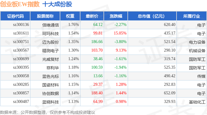创业板EW(399635)指数十大成份股详情如下:
