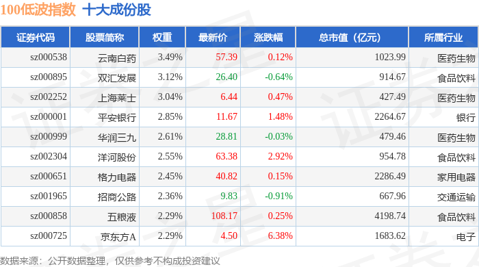 100低波(399645)指数十大成份股详情如下:
